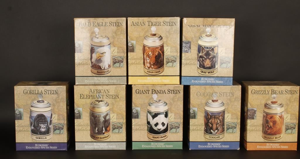Endangered Species steins by Budweiser and The National Wildlife Federation. Includes Cougar, African Elephant, Gorilla, Giant Panda, Gray Wolf, Grizzly Bear, Asian Tiger, and Bald Eagle. All in original boxes.