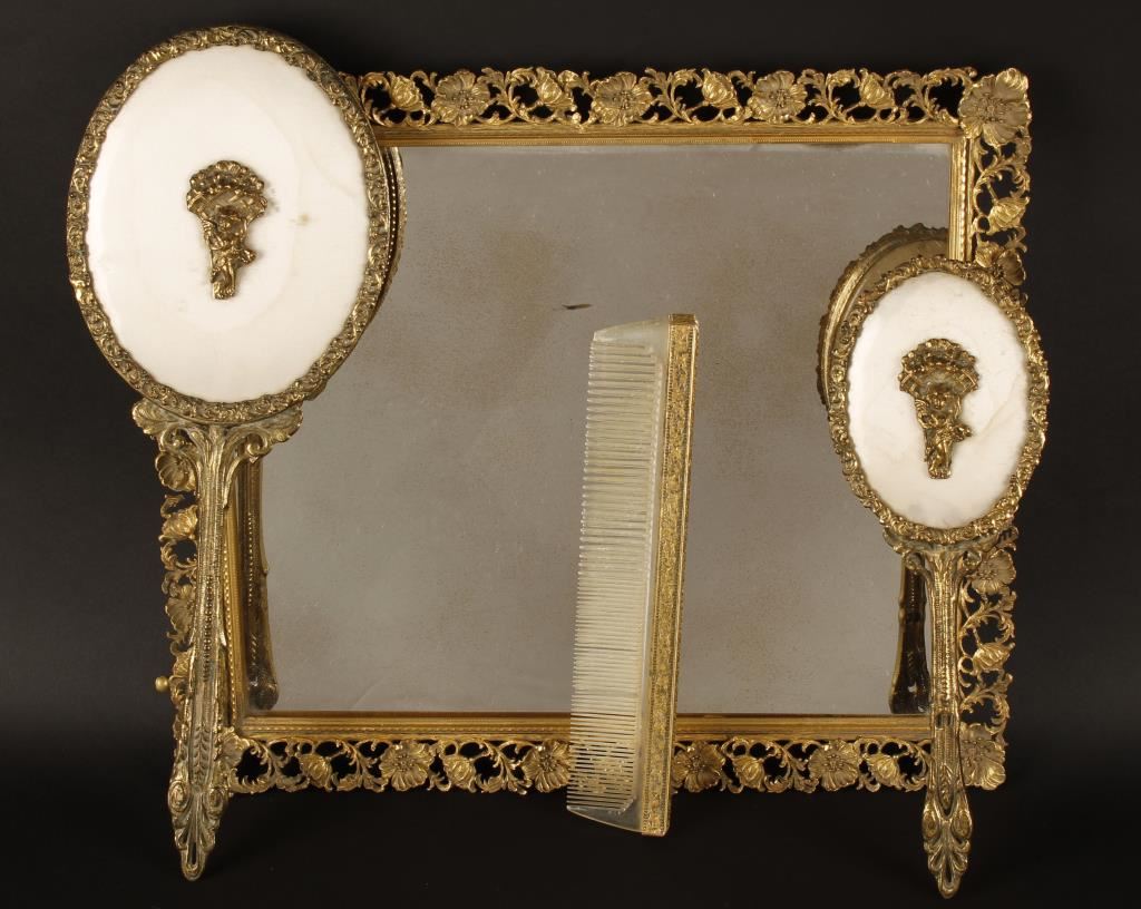 Includes, tray, brush, comb and hand held mirror. Brass construction with cherubs.