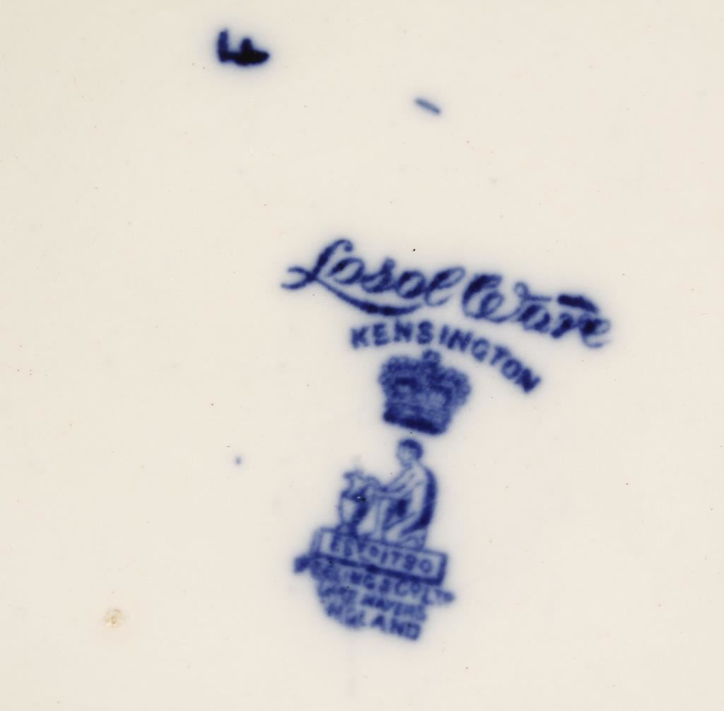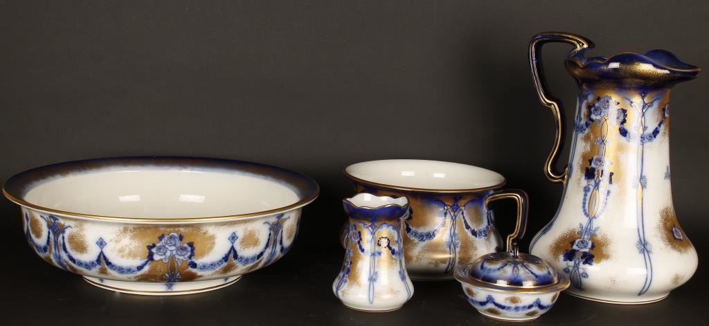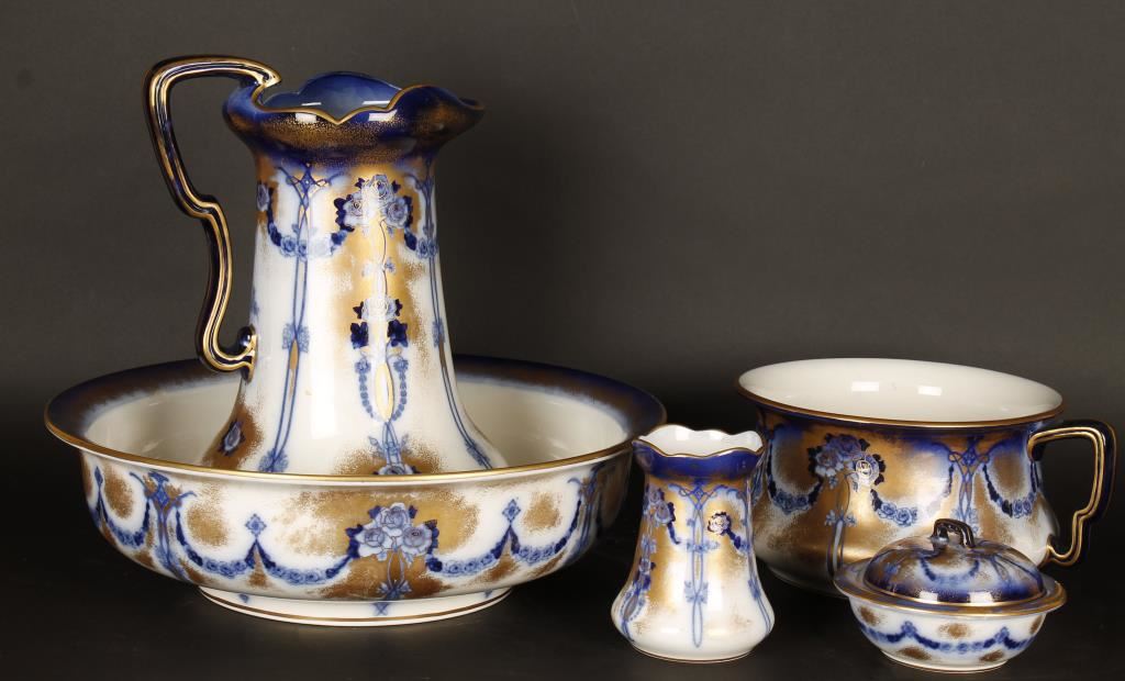 Made by Losolware Kensington in England which is marked on base. 5 piece set made in the Victorian era with luxurious pattern of dark cobalt blue roses and garlands with gold accents. Includes large bowl and pitcher, chamber pot, vase, and powder bowl with cover. The condition is excellent.