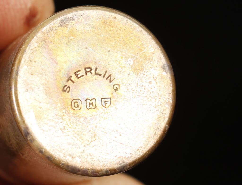 In oak spice rack, includes a set of 3 sterling silver salt and pepper shakers in box.