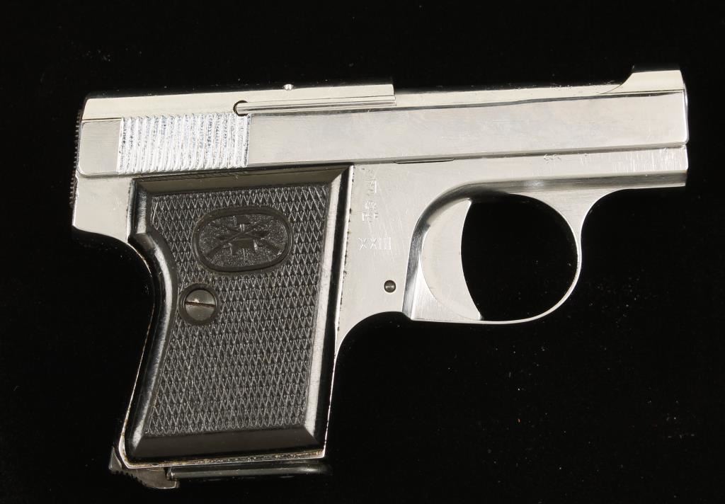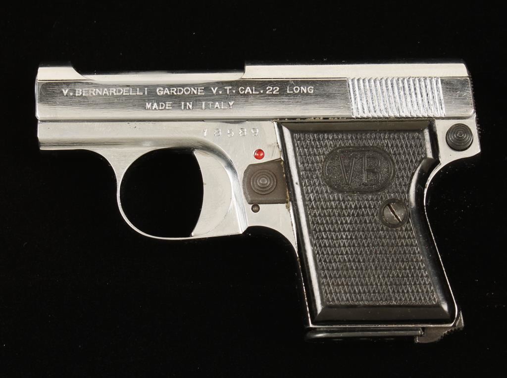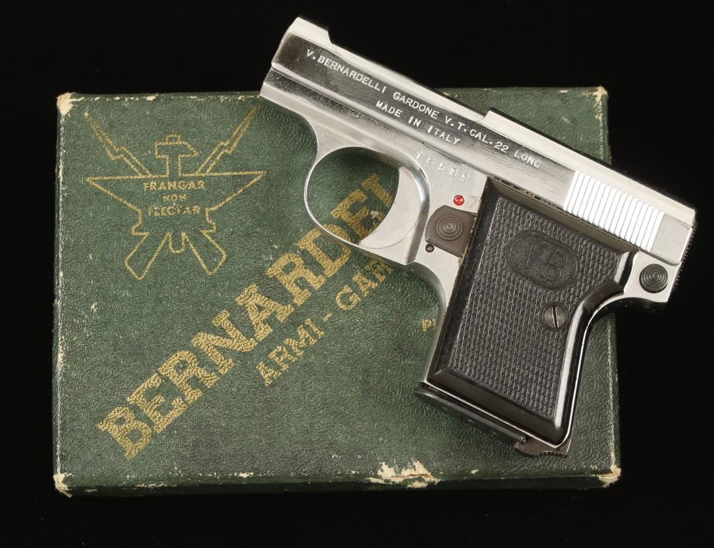 Chrome plated semi-automatic single-action hammerless pistol with a 2" barrel, plastic grips and one magazine. Plating is in very good condition. Bore is immaculate. Action works well. Includes a Bernardelli box with a Bakelite oiler and a soft bore cleaning brush. Condition is very good. *Modern Firearm*