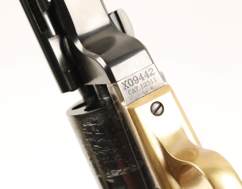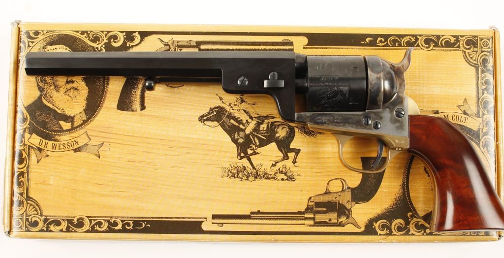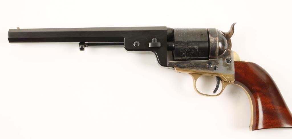 Italian made six shot single action revolver cambered in .38 Colt and S&W Spec. modeled after the Colt 1851 Richards Conversion. Features a 7.5" blued octagonal barrel, blued cylinder with naval scene. case hardened frame & hammer, brass backstrap & trigger guard and one piece walnut grips. Bore is perfect and likely unfired. Condition is near mint in box. ***Modern Firearm***