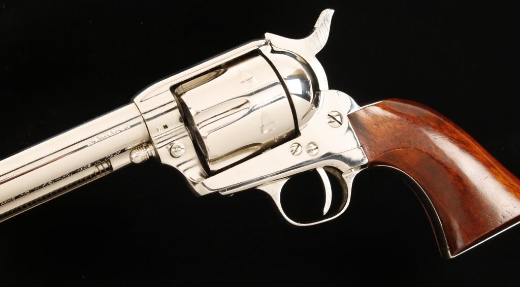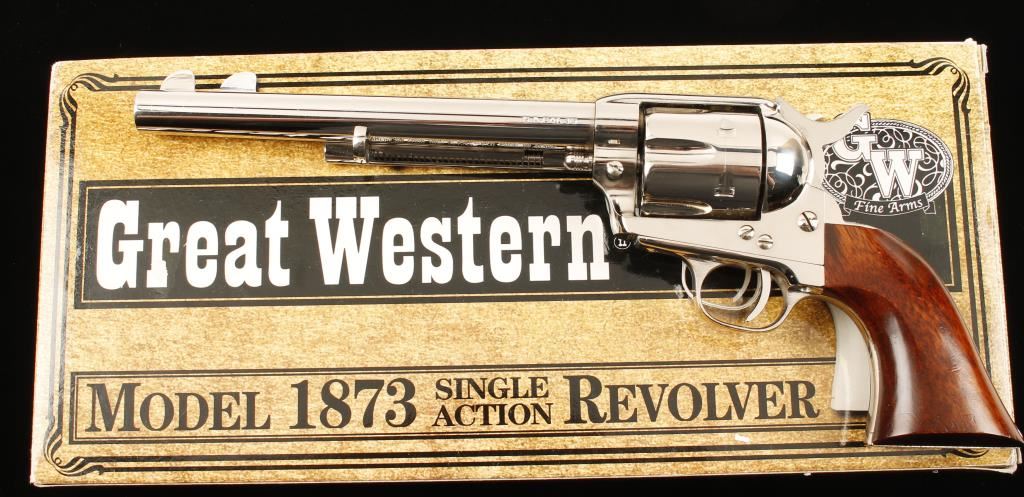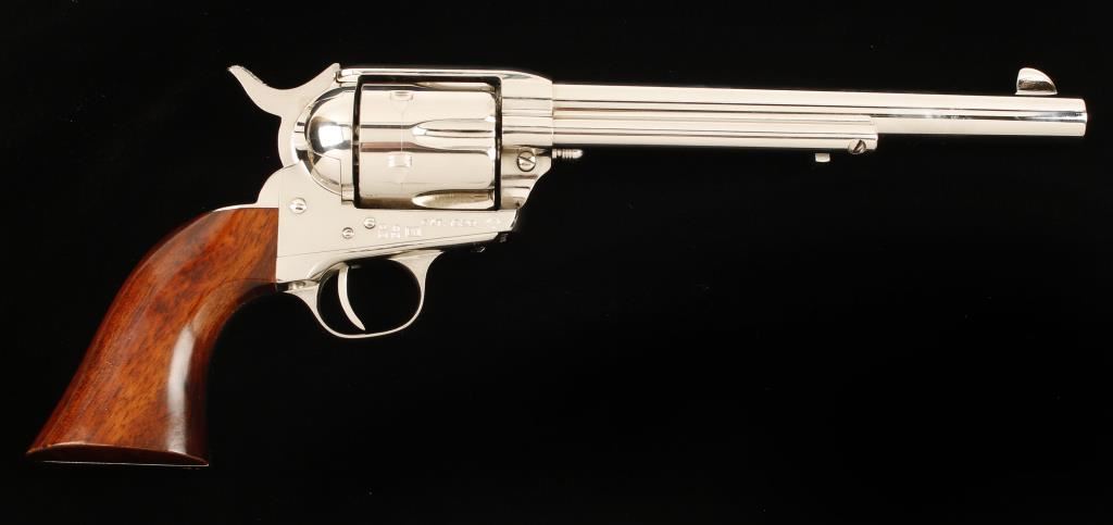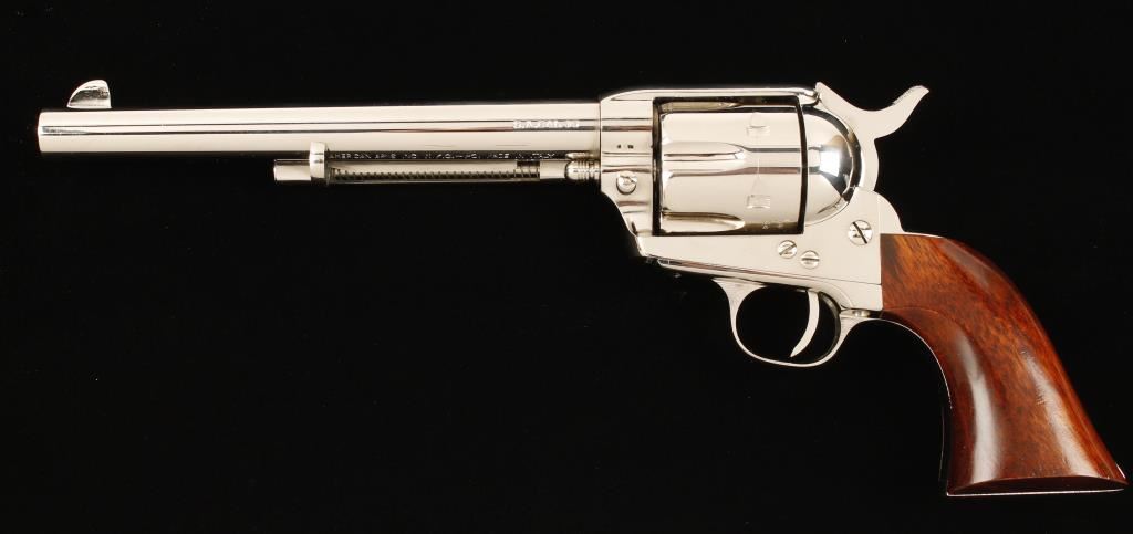 Italian made six shot single action revolver chambered in .45 caliber, manufactured by A. Uberti. Features a 7.5" nickeled barrel, nickeled cylinder, frame, trigger, trigger guard, hammer & backstrap and one piece walnut grips. Bore is excellent and action has been tuned with 3 lb. trigger pull. Includes a Great Western box unoriginal to gun. Condition is excellent. ***Modern Firearm***
