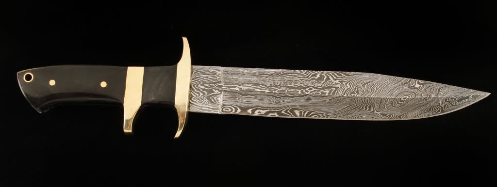 Bob Loveless inspired. 12.5" with a black bull horn and brass handle. Sharp blade is 8" and the handle is 4.5". Comes with handmade genuine leather sheath. Custom made by Kevin Johnson.