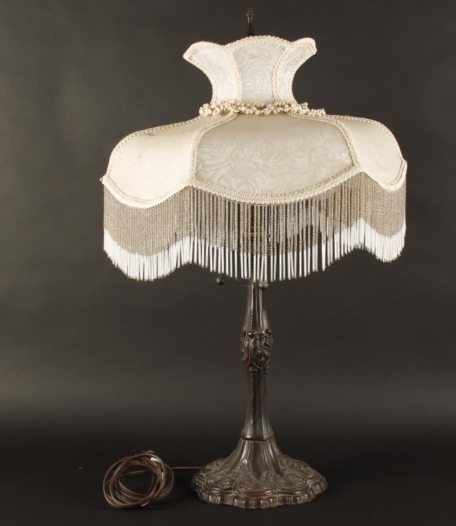 Metal base, cream colored silk beaded shade with fringe. Repro made to look like Victorian era. In working condition at time of description.