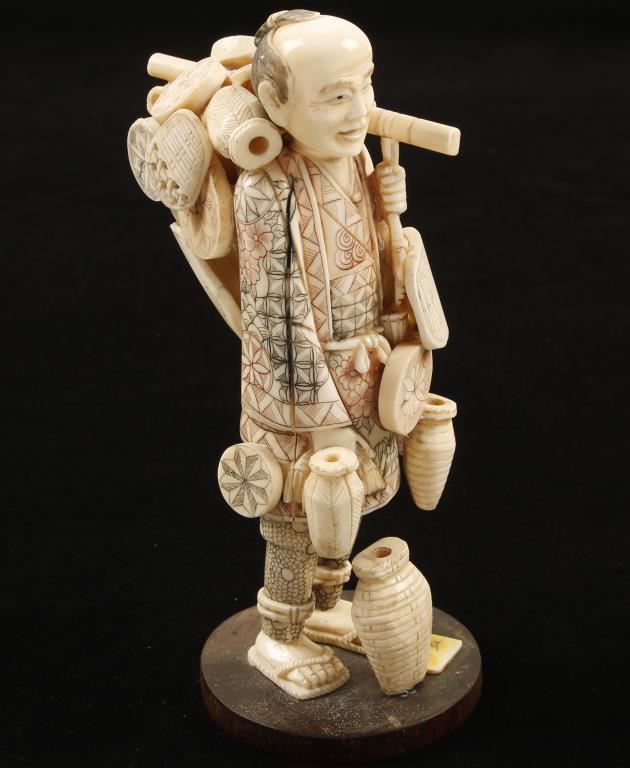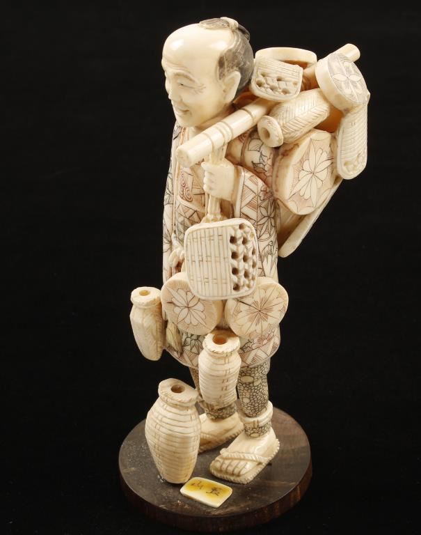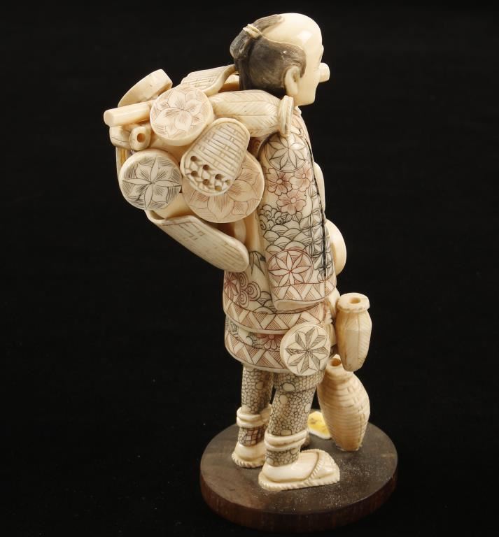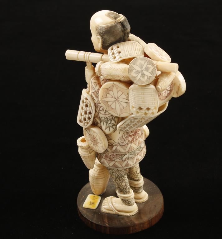 Hand carved ivory statue of a peddler with a pack full of goods. Not to be sold outside the state of AZ by law and commerce.