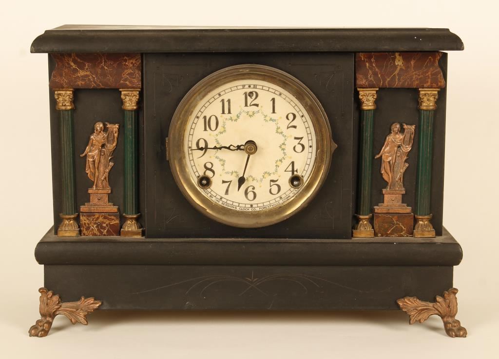 Grecian columns and musicians on front. Black wood case. Unknown working condition.