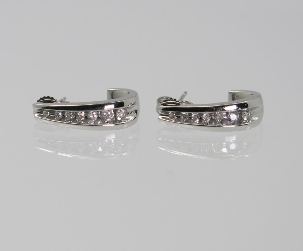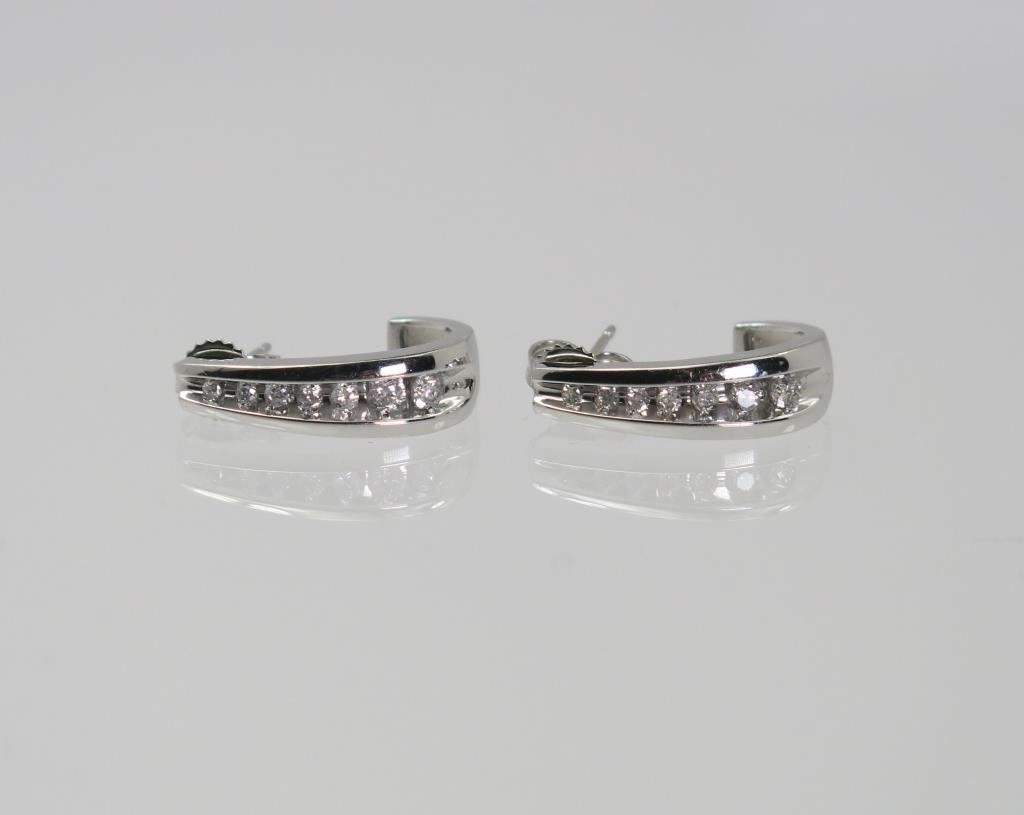 14 graduating round cut channel set diamonds weighing approx. 0.40 carats total with G-H colors set in 14 karat white gold.