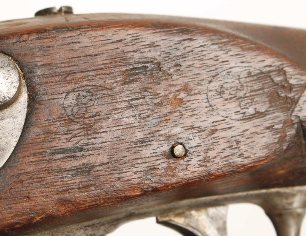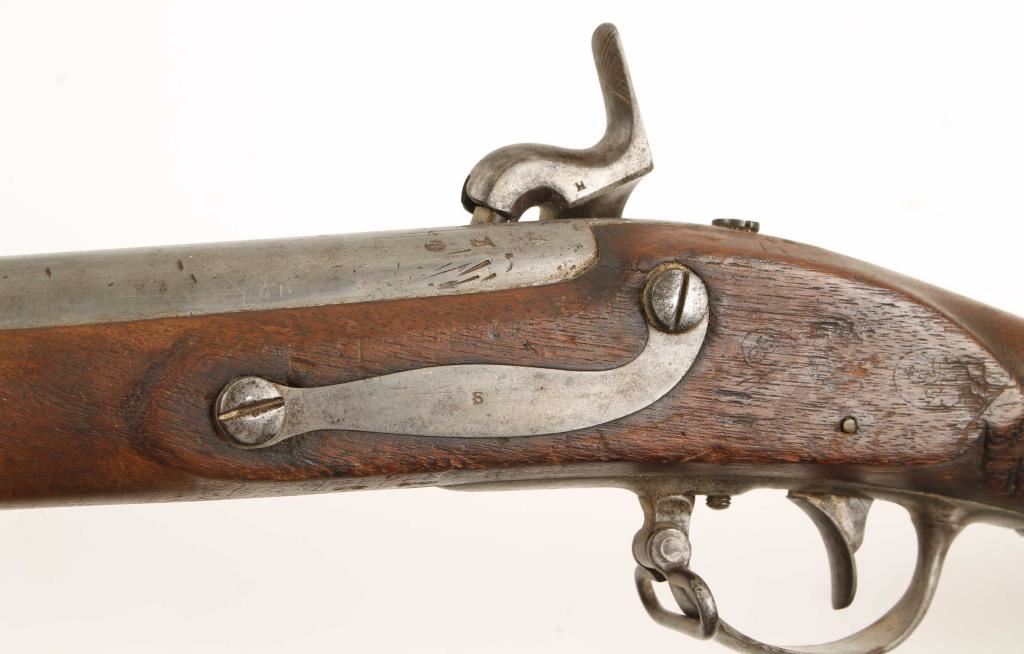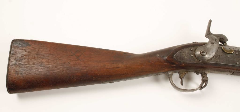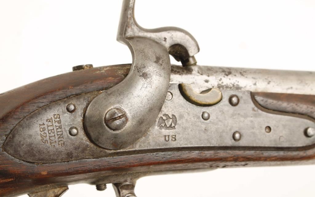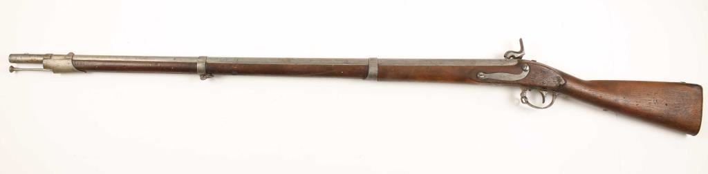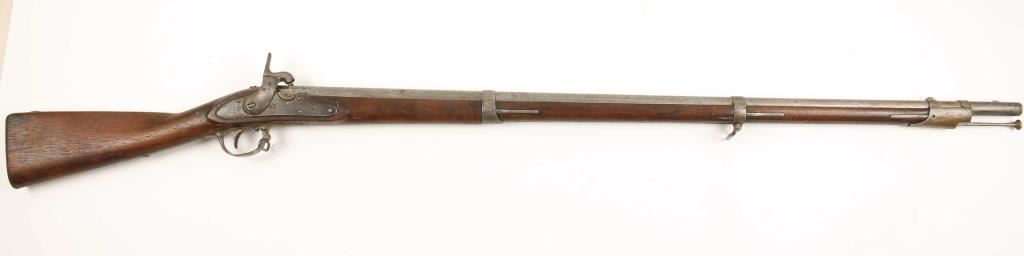 NVSN U.S. Military model 1816 flintlock rifle converted to percussion chambered for .69 caliber ammunition and manufactured by Springfield Armory. Features a 42" barrel with bayonet lug, steel button head ram rod, three barrel bands, brass blade sight on front barrel band, sling swivels and full wood stock. Markings: Lock- American eagle over 'US' 'Spring/Field/1825" Barrel- 'P' in oval, eagles head and V, Butt Plate - 'US', Trigger Guard - 'DB' & 'B' Barrel Bands - all marked 'S' as is sideplate and Stock - marked with two cartouches that are hard to make out. Condition: Barrel, barrel bands, side plate and trigger guard are all in-the-white with light scattered pitting, lock has a darker grey patina, buttplate has dark surface rust & stock is in good condition. Condition over all is very good as a converted antique. ***Antique Firearm***