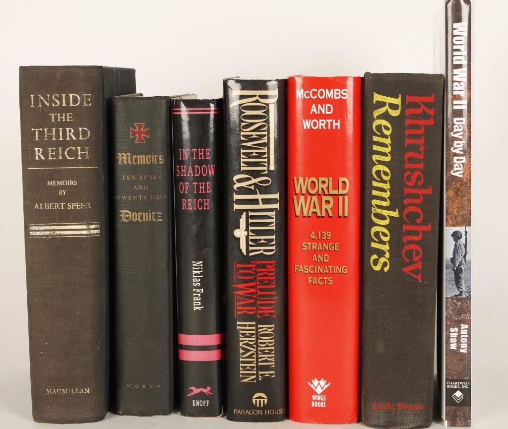 Includes: 'Roosevelt & Hitler Prelude to War', 'World War II 4,139 Strange and Fascinating Facts', 'Memoirs Ten Years and Twenty Days', ' Khrushchev Remembers', 'Inside the Third Reich, Memoirs by Albert Speer', "World War II Day by Day', and 'In the Shadow of the Reich'.