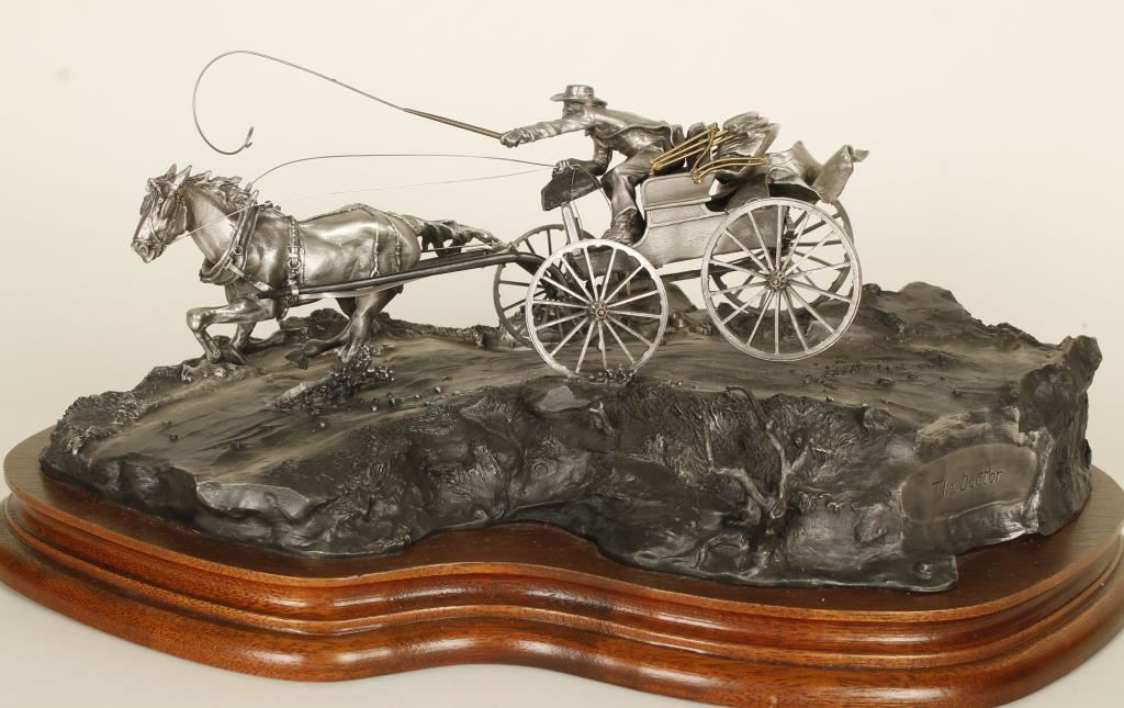 "The Doctor" 12"x4 1/2" Man in a buggy frantically urges his horse on with a whip while traveling a winding road.