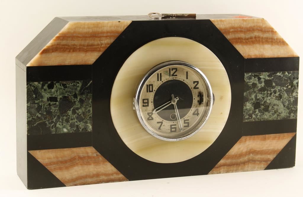 Black clock with marble inset design in separate pieces of green, rose, and ivory. Round clock face with glass cover that opens for winding. Not in working condition. Measures 18"x10"x3 3/4".