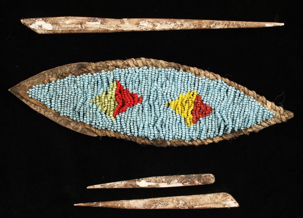 Vintage leather beaded awl case with blue, green, yellow, and red beads. Includes three needles.