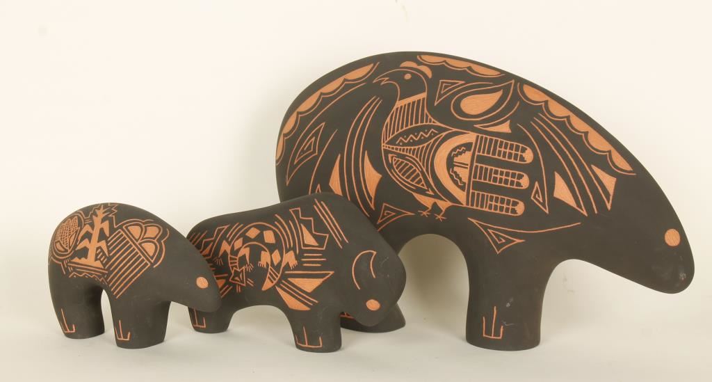 Incised carved depicting 2 bears and 1 buffalo. Signed 'AB'. Various sizes