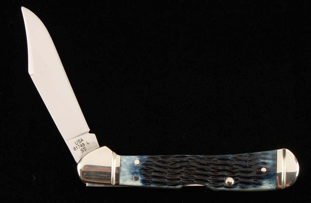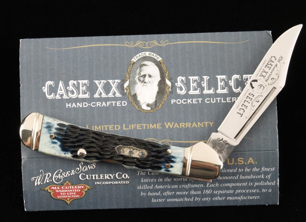 Etched single stainless steel blade reads 'Case select 10th Anniversary'. 61749LSS. Mediterranean blue bone handle, includes case.
