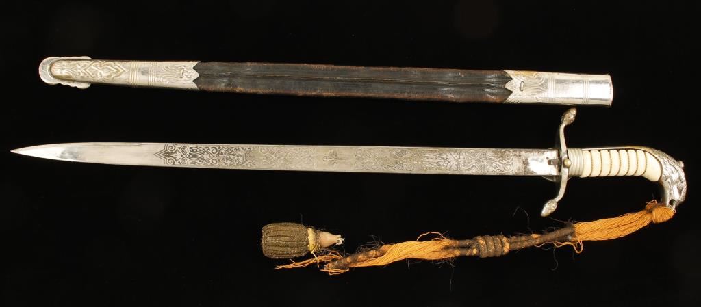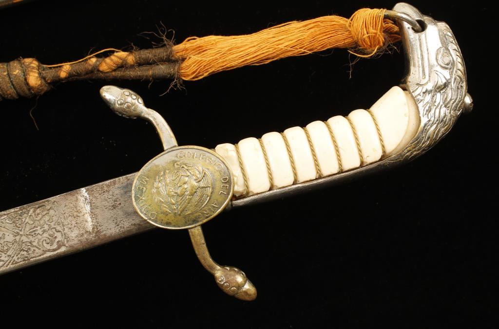 Beautiful hand etched blade with bleeding heart, scrolls, and armor. Mexican eagle on handle and white faux ivory handle which is wire wrapped. Includes leather scabbard. Dated 1916. Measures 25" overall with a 19" blade.