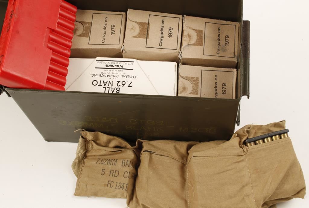 480 rounds of 7.62 NATO assorted ammo, including: 60 rounds in stripper clips in a bandoleer, 280 rounds in surplus boxes, 40 in plastic ammo boxes, and 100 rounds of Federal Ordnance ammunition. All in a green metal ammo canister.
