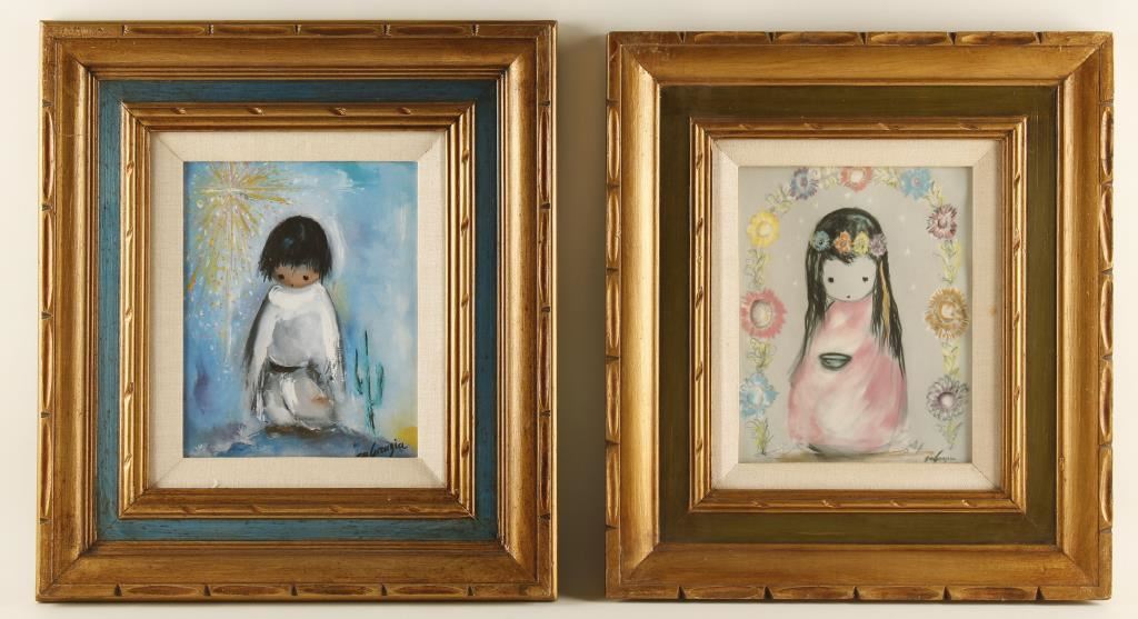 Both depicting children in wide wooden gold tone frames with linen insets. Images measure 9 1/2"x7 5/8". From Wikipedia: 'Ettore "Ted" DeGrazia was an American impressionist, painter, sculptor, composer, actor, director, designer, architect, jeweler, and lithographer. Described as "the world's most reproduced artist", DeGrazia is known for his colorful images of Native American children of the American Southwest and other Western scenes. DeGrazia also painted several series of exhibitions like the Papago Legends, Padre Kino, Cabeza de Vaca.'