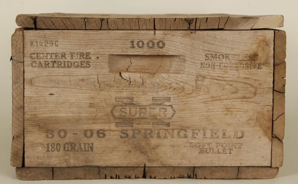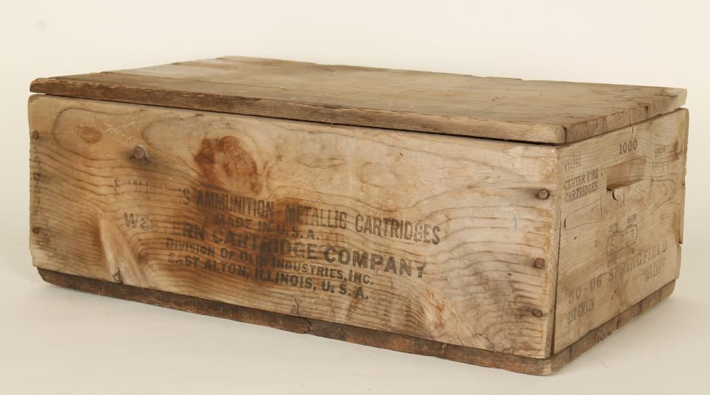 Rustic wood construction, top is nailed shut. Front reads "Small Arms Ammunition, Metallic Cartridges, Made in USA, Western Cartridge Company, Division of Olin Industry, Inc., East Alton Illinois, USA." Side describes cartridges. Measures 18 3/4"x11 1/2"x7.