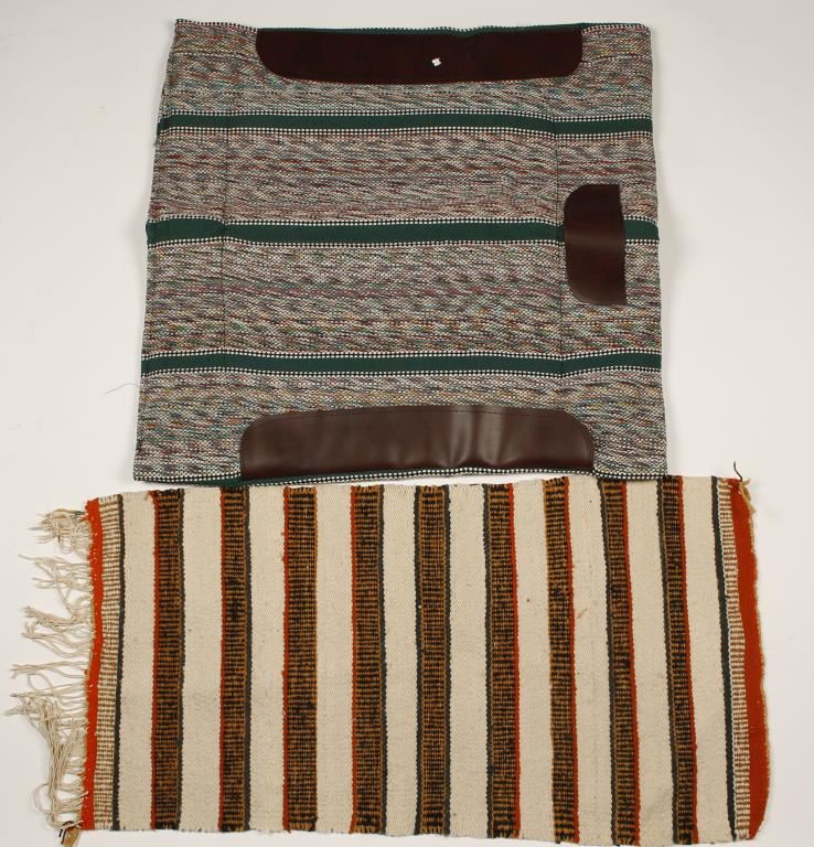 28" x 28" Saddle pad with leather accents and 36" x 18" saddle blanket with fringe on one side. Overall condition for pad is very good and the blanket is good.