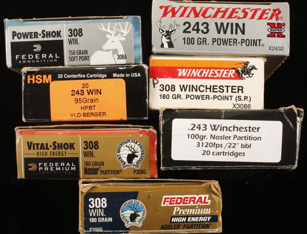 Includes 13 rounds of Federal Power Shok Medium Game .308 150 grain soft points, 6 rounds of Federal High Energy Nosler Partition .308 180 grain soft points, 7 rounds of Winchester Power-Point .308 180 grain soft points & 12 rounds of Federal Vital-Shok Nosler Partition .308 180 grain soft points. Also included are 9 rounds of Winchester X Super .243 100 grain Power-Point, 12 rounds of Double Tap Ammunition .243 100 grain Nosler Partition & 15 rounds of HSM Trophy Gold .243 95 grain HPBT. 74 rounds in all with most cases having all there spent brass.