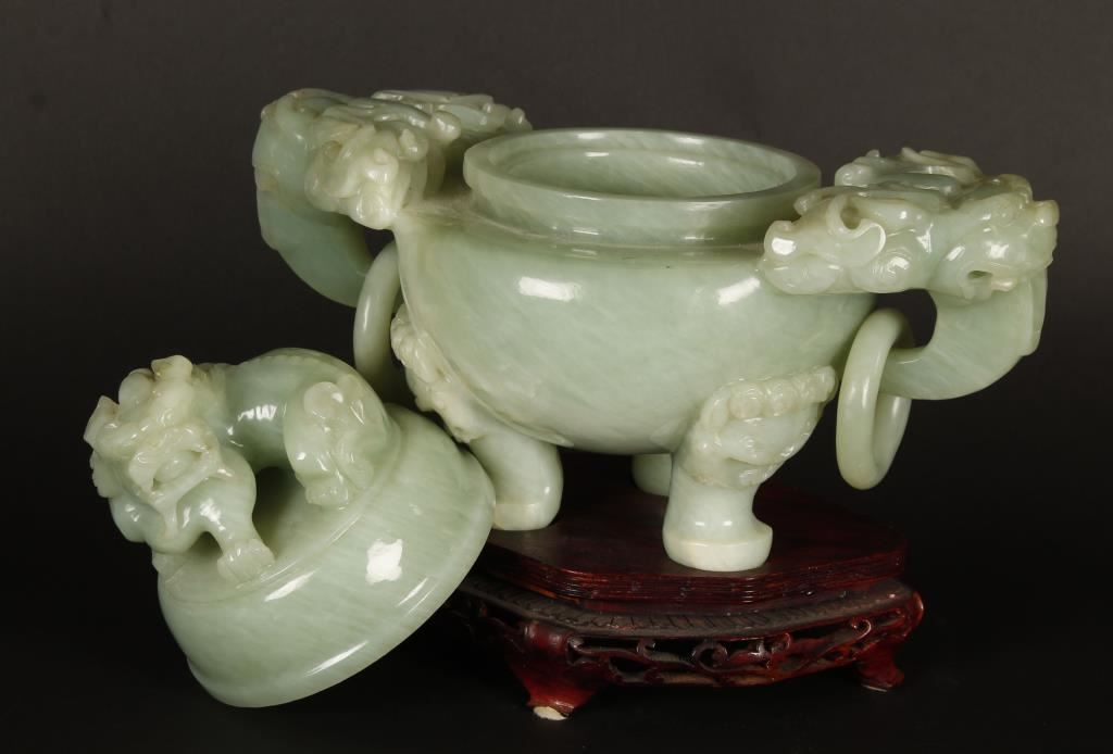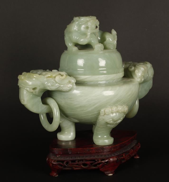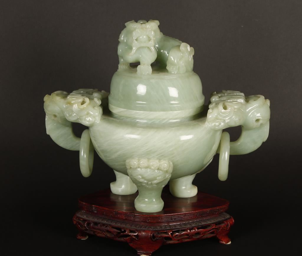 Beautiful light green jade three footed jar. Top of jar has a crouching Foo Dog and each side has an elephant head handle with a jade ring through it's trunk. Substantial piece, great decorator! 10"h x 11 1/2"w. Comes on a carved wooden stand that adds 2" to height.