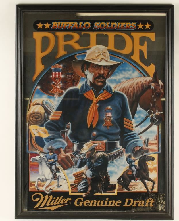 Reads "Buffalo Solders PRIDE" across the top with scenes of soldier with horse, on horseback and scouting with binoculars. "Miller Genuine Draft" across the bottom. Measures 24 1/2"x33" in black frame.