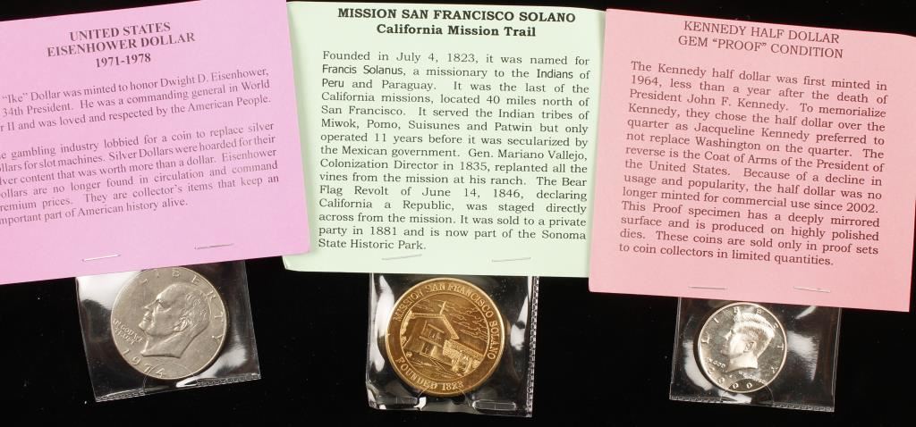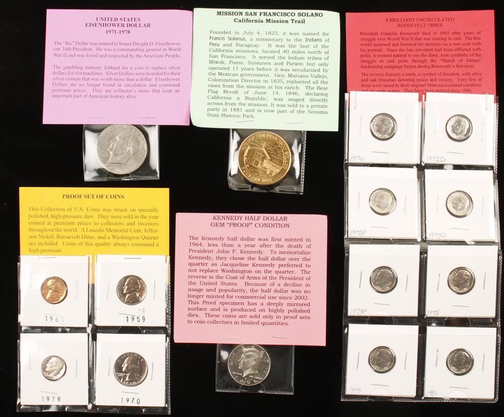 Including: US Eisenhower Dollar 1974, Mission San Francisco Solano CA Mission Trail Coin, Kennedy Half Dollar Gem "Proof" Condition 2000, Proof Set of 4 Coins, and 8 Brilliant Uncirculated Roosevelt Dimes.