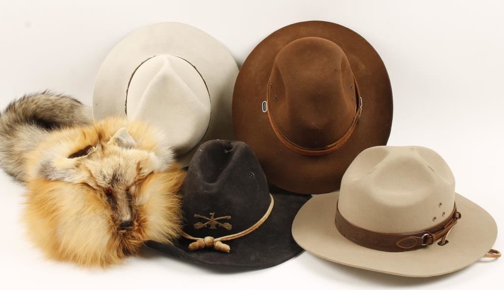 1 Red fox fur hat from the Anchor Trading Post, 1 Australian Bush hat, 1 navy colored Cavalry hat with '7A' and gold cord on the front., 1 tan Stratton hat, size 7-1/2 with leather chin strap, and 1 brown Trooper hat. All show use and wear.