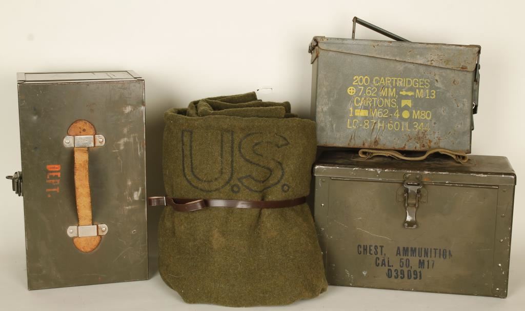 Metal ammo cans with canvas, leather and metal handles. Green wool blanket marked "US".