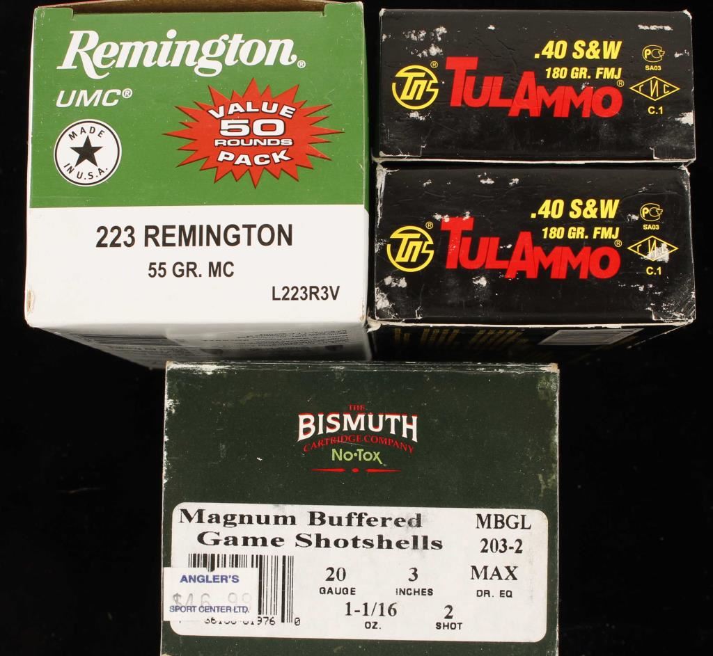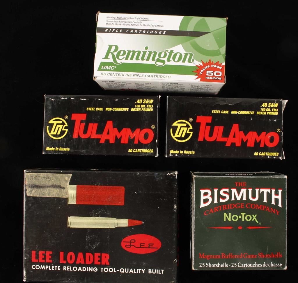 Including: (1) 50 round box of Remington UMC .223 Rem 55 grain MC, (2) boxes of 50 round TulAMMO .40 S&W 180 grain FMJ with steel cases, (1) 25 round box of Mismuth 20 gauge magnum 3" non toxic buffered game shotshells 1 1/16oz 2shot, and complete Lee Loader for pistol cartridges in .357 magnum.