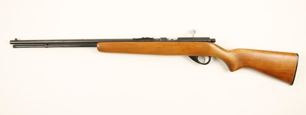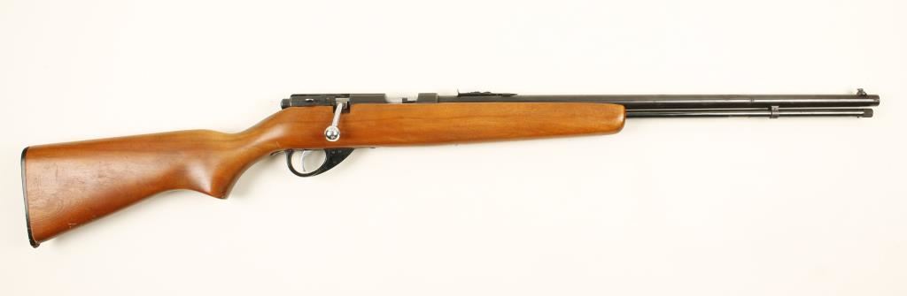 Blued bolt-action tube magazine fed rifle with a 22" barrel, brass bead front sight and ramp adjustable rear sight. Bluing has some surface rust and some mottling from rust stains/wear. Receiver has dovetail cuts on top for Weaver style scope mounts. Bore is bright and shiny with rifling. Action works well. Plastic trigger guard has many dings and dents. One piece wood stock has dings, rubs and dents. Butt plate is not original and is too long for the butt. Condition is good. *Modern Firearm*