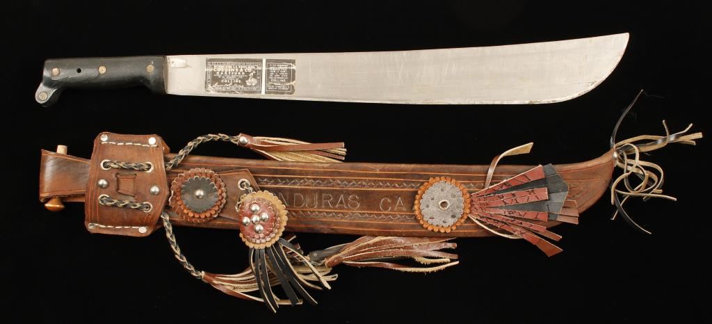 Ornate scabbard with fringe and leather medallions reads "Honduras CA". Machete measures 18 1/2" long and Legitimus Collins Co. Ind. Col." is etched on blade that shows wear. Sticker for the company on opposite side of blade.