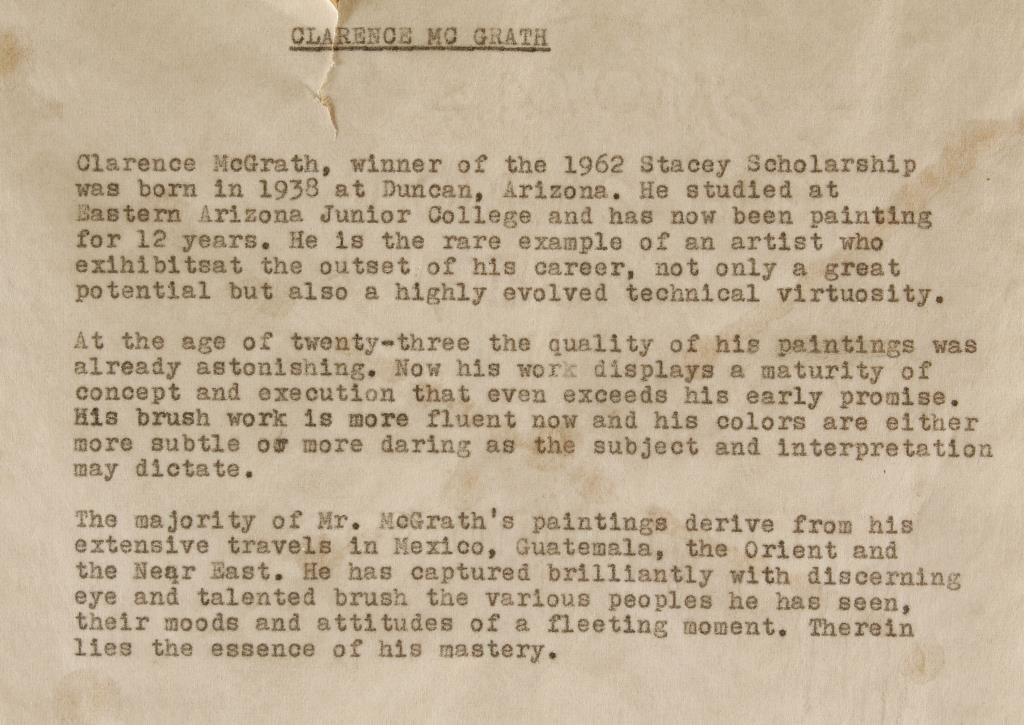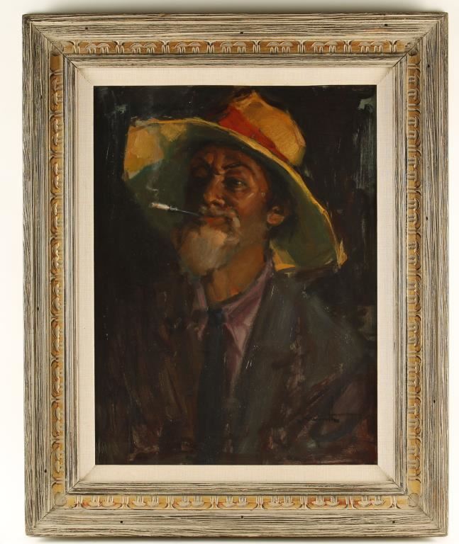"Duke" depicts bearded man in wide brimmed hat smoking a cigarette in a black holder with an amused look on his face. Image measures 17 1/2"x23 1/2" in whitewashed wood frame with gold accents and linen insert. Clarence McGrath was born in 1938 in Duncan, AZ. He studied at Eastern Arizona Junior College and is the rare example of an artist who exhibits at the outset of his career, not only a great potential, but also a highly evolved technical virtuosity. The majority of Mr. Mc Grath's paintings derive from his extensive travels in Mexico, Guatemala, the Orient, and the Near East. He has captured brilliantly with discerning eye and talented brush the various peoples he has seen, their moods and attitudes of a fleeting moment. Therein lies the essence of his mastery. (Found on back of painting).