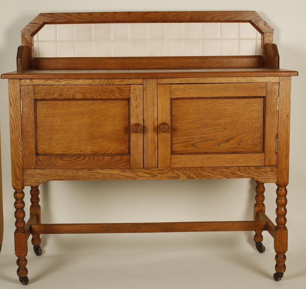 White tiled top & back splash with two cupboards. Measures 42"x 41"x 17"