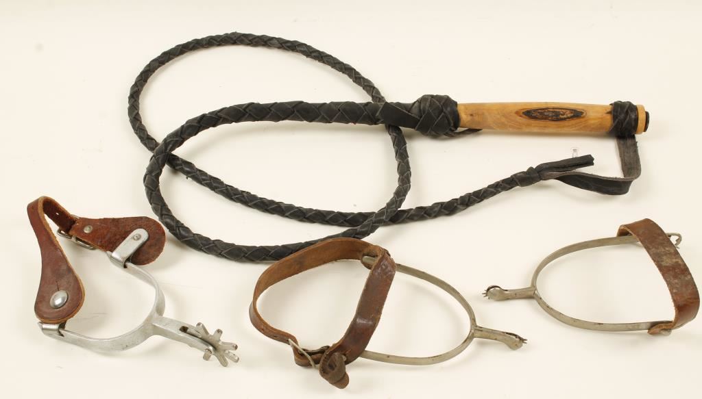 Including; rawhide bull whip, matched pair of nickeled spurs and one other spur.