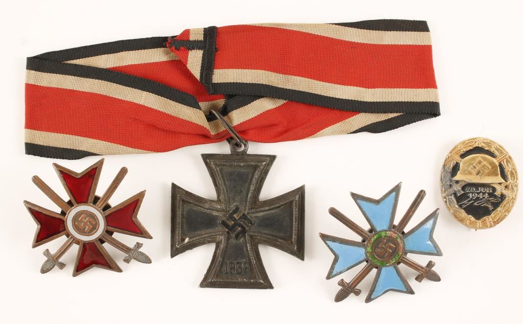 Knight's Cross with ribbon, 2 Merit Crosses and 1 other. In black cardboard box with glass front. Measures 8 1/4"x12 1/4".