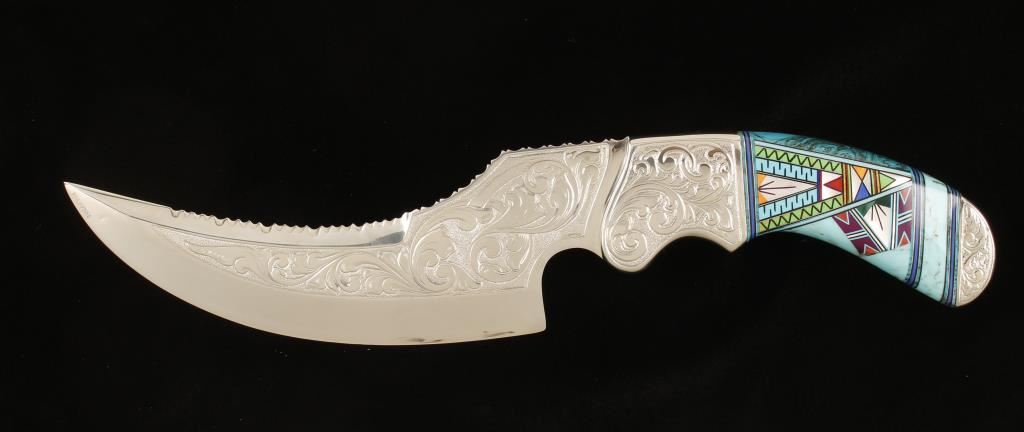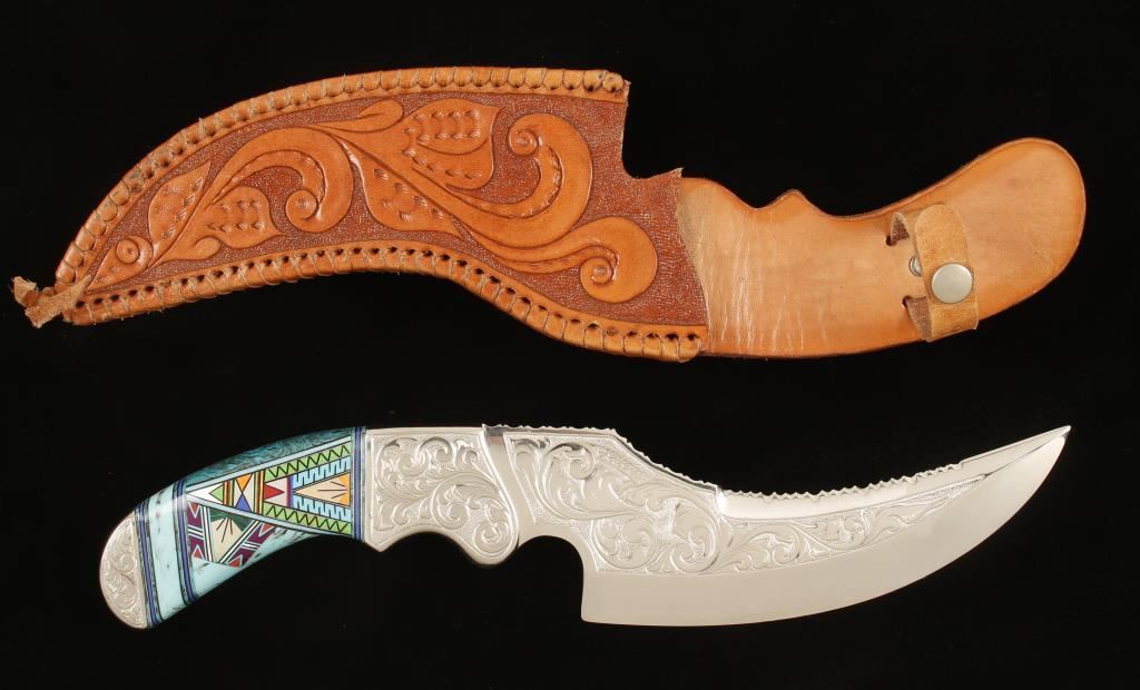 Presentation grade skinning knife marked 'Diamond' Lil 4 of 25 with scroll engraved blade and bolsters, tooled leather sheath and ornate inlayed handle with turquoise, mother of pearl and other stones in a geometric Native American pattern.