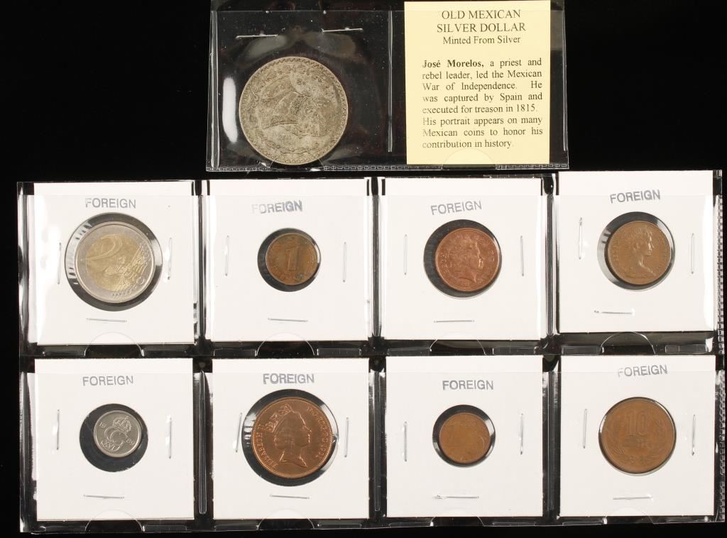 8 Foreign coins and an old Mexican Silver Dollar dated 1959 with Jose Morelos on it.