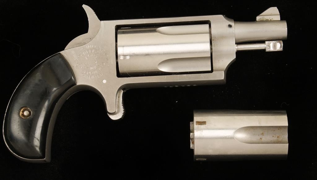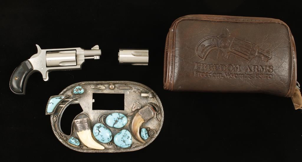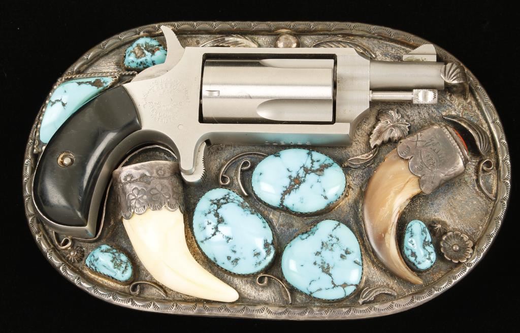 SN: B31270 Stainless single-action spur trigger 4-shot revolver with a 1-1/4" barrel, black plastic grips, a second cylinder, gun rug and an ornate custom hand-made Native American belt buckle to carry it. Matte and brushed stainless steel finish with a few rubs and spots. Bore is dirty with sharp rifling. Chambers for both cylinders look dirty and may clean up. One cylinder is numbered to the pistol. There are slight drag lines on both cylinders. The sterling belt buckle has turquoise, coral, a tooth and a claw on it. The back has the silversmiths hallmark of a fish with 3 crosses in it. The pistol is held with a rod down the muzzle and a rod in one of the chambers of the cylinder (making it into a 3-shooter). The grips have a few dings, scratches and wear. Action is good with good lock-up. The buckle is 5-1/2" by 3-3/8". Condition is good. *Modern Firearm*