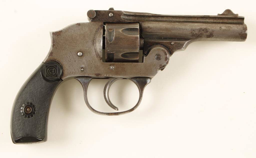 SN: L65059 Made for Fred Biffar Co. of Chicago in the early 20th century. Blued top-break 5-shot hammerless double-action only revolver with a 3" barrel and hard rubber "target logo" grips. These pistols were made by at least four makers. A source states that the front sight is indicative of manufacture by Meriden Firearms Co. but the grips are H & R. The metal finish is primarily grey bare metal with bluing only in protected areas. There are some areas of surface rust. There are dings and scratches near the pins on the frame. The right grip has a chip missing from the bottom rear corner exposing the locating pin and there are initials scratched into the bottom of both grips, checkering is good and sharp. The bore is shiny with pitting and rifling. The chambers have no defects. Action works well and the lock-up is not too sloppy. Includes a small article on these revolvers. Condition is fair to good. *Modern Firearm*