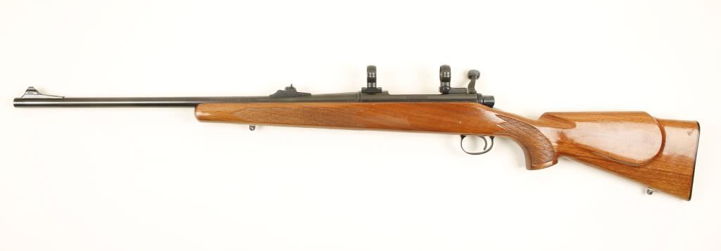 Blued bolt action rifle with a 22" barrel with iron sights, blind magazine (ADL), unmarked 2-piece Redfield style scope bases and 1" rings. Bluing has wear on the bolt handle, edge wear and a little fading on top of the barrel. Bore is in very good condition. Action is very smooth and works well. Wood stock has pressed checkering and no frills with a plastic butt plate. LOP is just under 13-1/2". There are many small scratches, scrapes and dings. Condition is good to very good. *Modern Firearm*