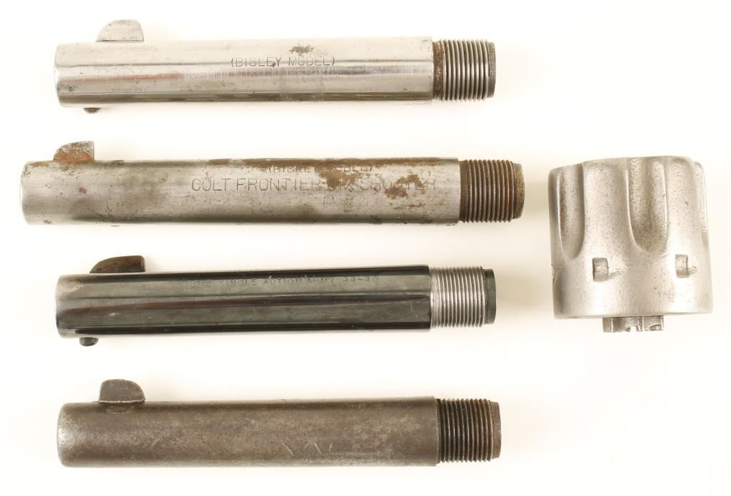 (1) 4 3/4" blued barrel marked "Colt Single Action Army 44-40" (1) 4 3/4" nickeled barrel marked "(Bisley Model)" in .45 & (1) 5 1/2" with no finish remaining marked "(Bisley Model) Colt Frontier Six Shooter" in .22. Also included is a .45 Colt cylinder & (1) 4 3/4" blued unmarked barrel.