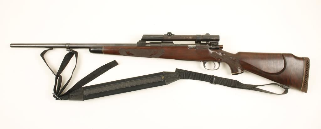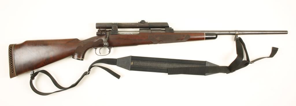 Blued bolt-action with a 23" barrel, a wood American Classic stock, a scope, sling and recoil pad. LOP is 13-1/2". Bluing has faded to grey with freckles of surface rust and light pitting. Receiver was made at Danzig arsenal in 1915. Numbers on bottom metal and floorplate don't match the receiver number but the floorplate is hinged. Bore is pristine with strong rifling. Crown is military round crown and has a little pitting. Low scope safety appears to have been handmade. Bolt body, follower and extractor are jewelled. Stock is a dark stained hardwood with lots of fiddleback in the butt. Carved wood and checkered panels on the wrist and forend and the checkering is still sharp. There is a shadow line under the cheek rest. There are two notable dings, one near the bottom metal and one near the forend cap. Other marks are small scratches and dings. Forend cap, grip cap and recoil pad all have white line spacers. Recoil pad spacer is larger than the stock. Grip and forend caps are smaller than the stock. Scope is marked "Germany" only. There are no maker or power markings. Rear scope mount is cantilevered off the right side of the receiver bridge and has a knob to adjust windage. There is an adjustment for elevation on top of the tube. The reticle is a 3-post type. Power is about 2X. QD sling swivels. Action works well. Condition is very good. *Modern Firearm*
