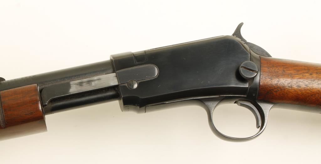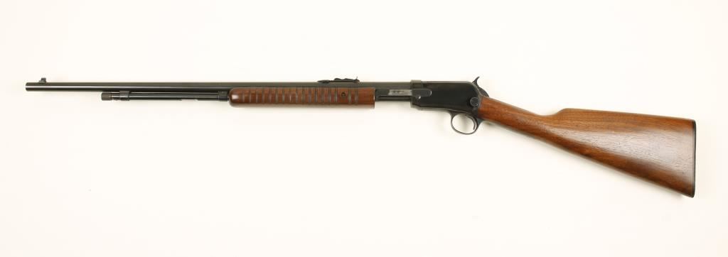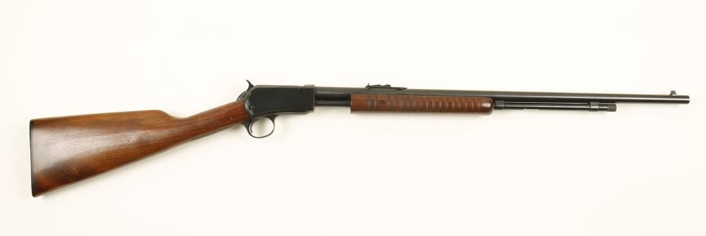 Slide action tube fed take-down rifle chambered in .22 caliber by Winchester. Features a 23" blued barrel, adjustable sights, blued receiver, serrated trigger, large grooved slide handle and straight grip walnut stock. Condition is very good. ***Modern Firearm***