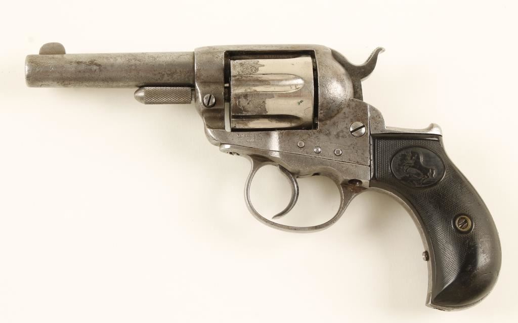Nickel plated double action 6-shot revolver with a 3-1/2" barrel and hard rubber grips. Made in 1891. Matching numbers. The metal finish on the frame has worn to bare metal with evidence of past pitting. The cylinder retains much of the nickel plating. The bore is filthy and may have extensive rust or pitting. The chambers are dull and dirty and may have rust or pitting. Action works the hammer in double action only. The cylinder doesn't rotate in either single or double action and the hammer doesn't cock in single action. The cylinder doesn't lock. The trigger doesn't reset. The checkered grips are worn smooth over much of their surface but are complete. Condition is poor to fair. *Antique Firearm*