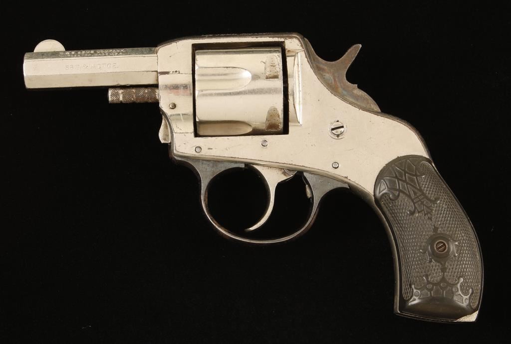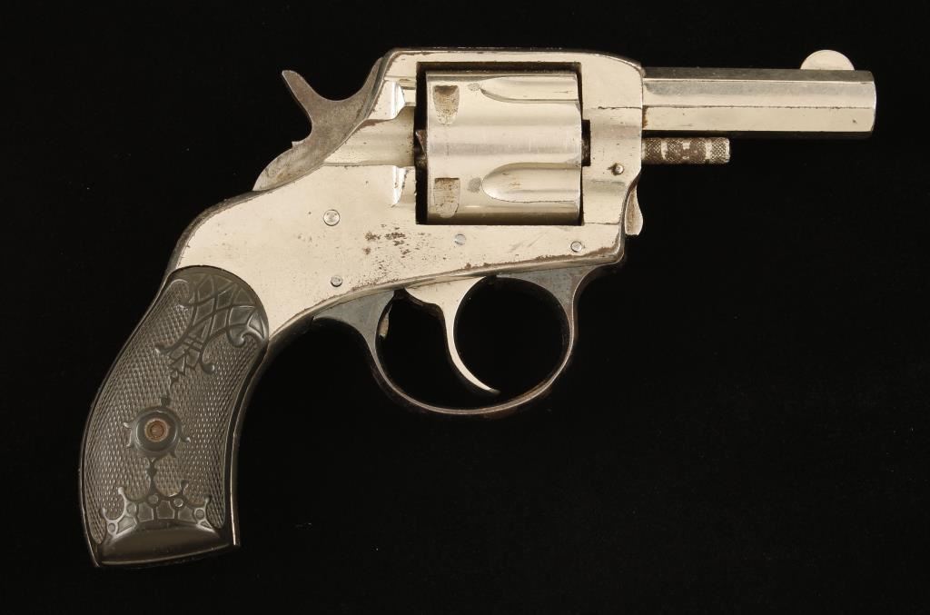SN: 172644 Second model. Nickel plated double-action 5-shot revolver with a 2-1/2" octagon barrel and checkered hard rubber grips. Plating is mostly present but has worn off the edges to bare metal and surface rust. Case colored hammer retains some of the color. Blued trigger guard has worn to a faded color with some light surface rust spots. Left grip has a chip out of the bottom exposing the locating pin in the frame and both grips have wear to the points of the checkering. The action is unreliable between not rotating the cylinder far enough or not letting the hammer fall completely. Bore is a little dull with light surface rust and pitting. Condition is fair. *Modern Firearm*