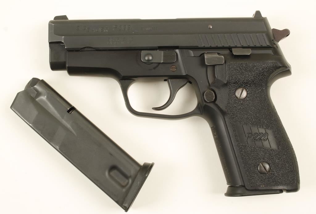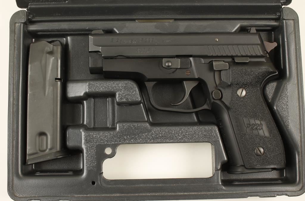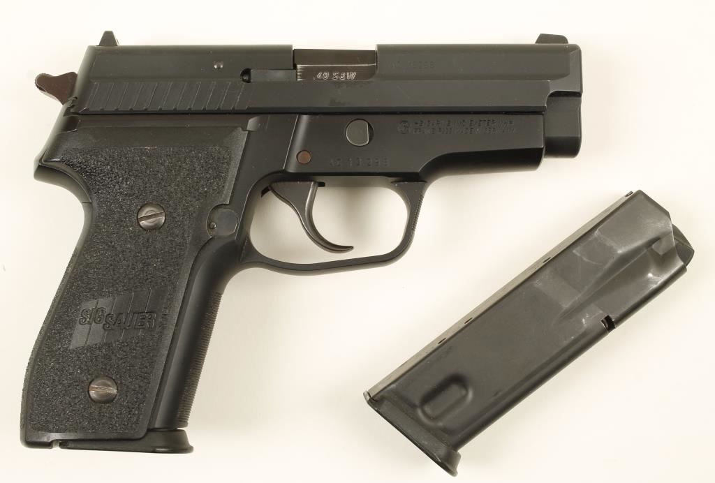 Black finished stainless double-action semi-automatic pistol with de-cocker, polymer grips, 3-7/8" barrel, two 12-round magazines and a Sig Sauer factory box. Metal finish is good with a scratch behind the ejection port, a rub from the takedown lever and light edge wear. Frontstrap and trigger guard are serrated. Action works well. Bore is mirror bright with sharp rifling. Condition is very good. *Modern Firearm"