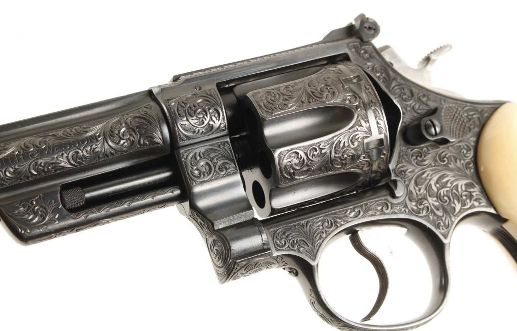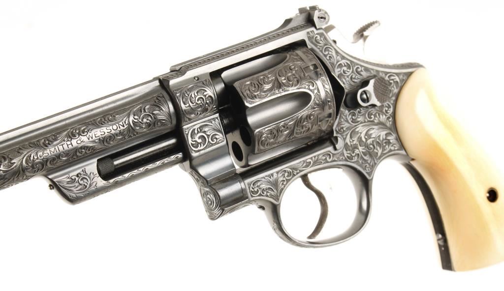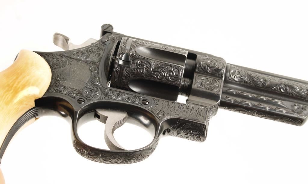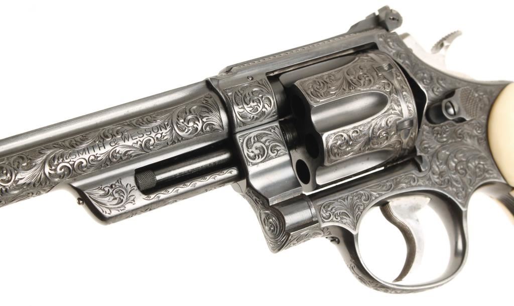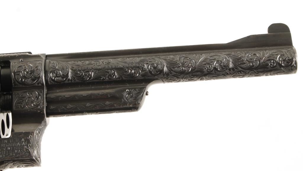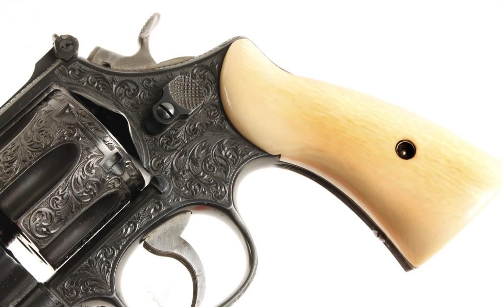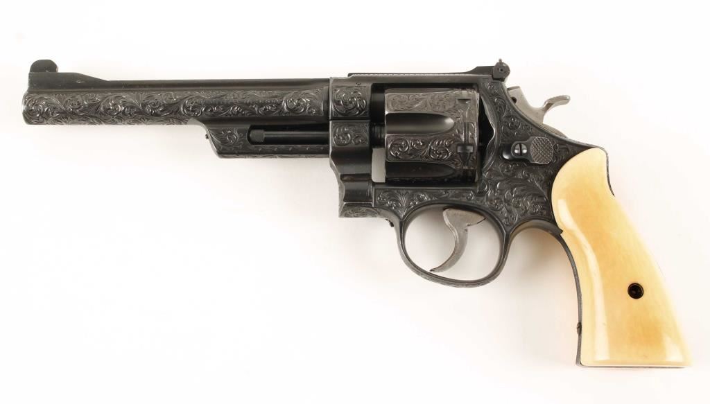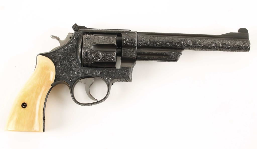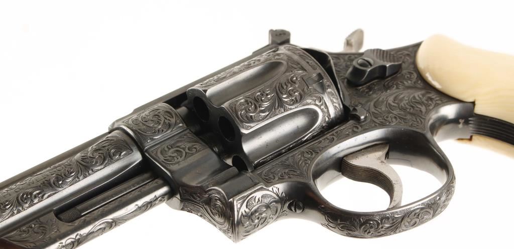 SN: S77202 Model of 1950. Factory engraved. Blued double-action 6-shot target revolver with a 6-1/2" barrel with a top rib. Adjustable rear sight. Almost full-coverage engraving in the style of R.J. Kornbrath. The grip frame under the left grip panel is stamped "R. J. Kornbrath" although he died in 1946 after suffering a debilitating stroke in 1937. The finish has a slight drag line. Has a checkered hammer with a .400" wide spur. Serrated trigger and grip straps. Bore and chambers are shiny and there is sharp rifling. Ivory grips in good condition with small grips between them and the frame. Condition is excellent. *Modern Firearm*