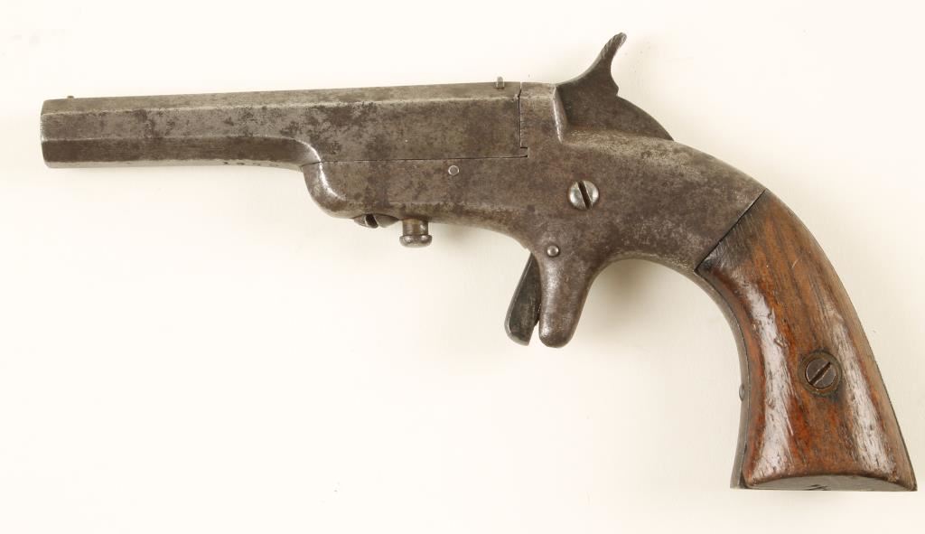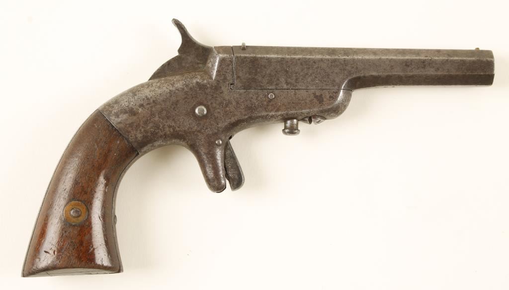 Blued single-shot single-action spur trigger rimfire pistol with a 3-7/8" barrel and wood grips. All matching numbers. Metal finish is worn to a mottled grey/black patina. Bore is dark with rifling and deep' heavy pitting. Action works well. Grips are tight with wear and dings and chips. Condition is poor. *Antique Firearm*
